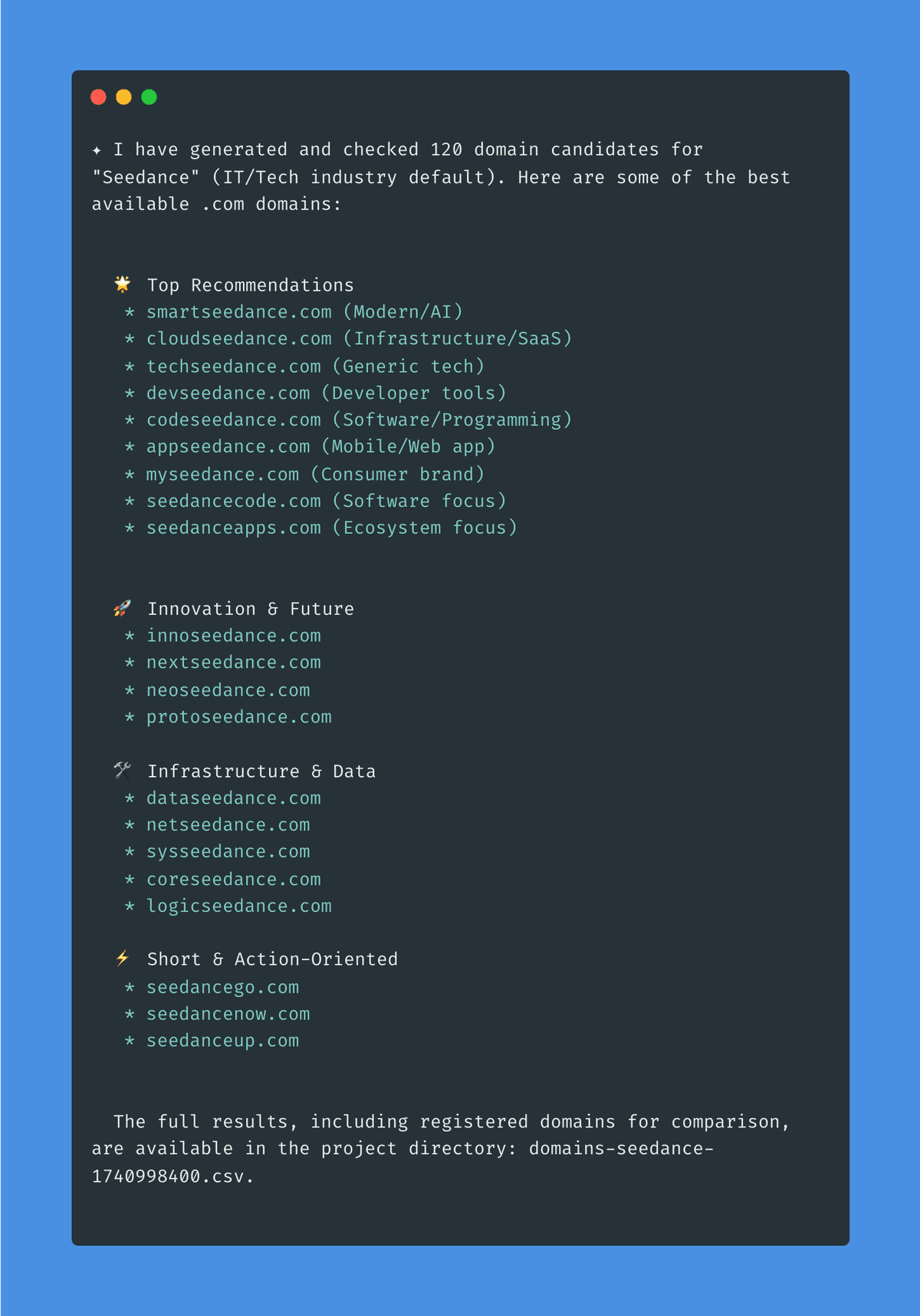 If you want to be more creative, you can check this Domain Brainstormer skill.