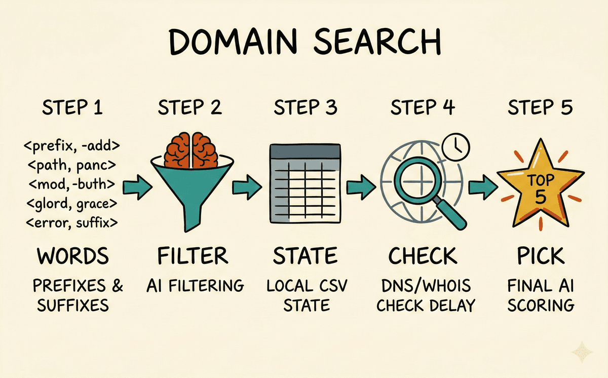 If I'm building a developer tool, I don't need to check combinations with fit, gym, or beauty. Using AI as a filter, rather than a simple generator, cuts the list from 5,000 random domains to 200 that actually fit the product.
