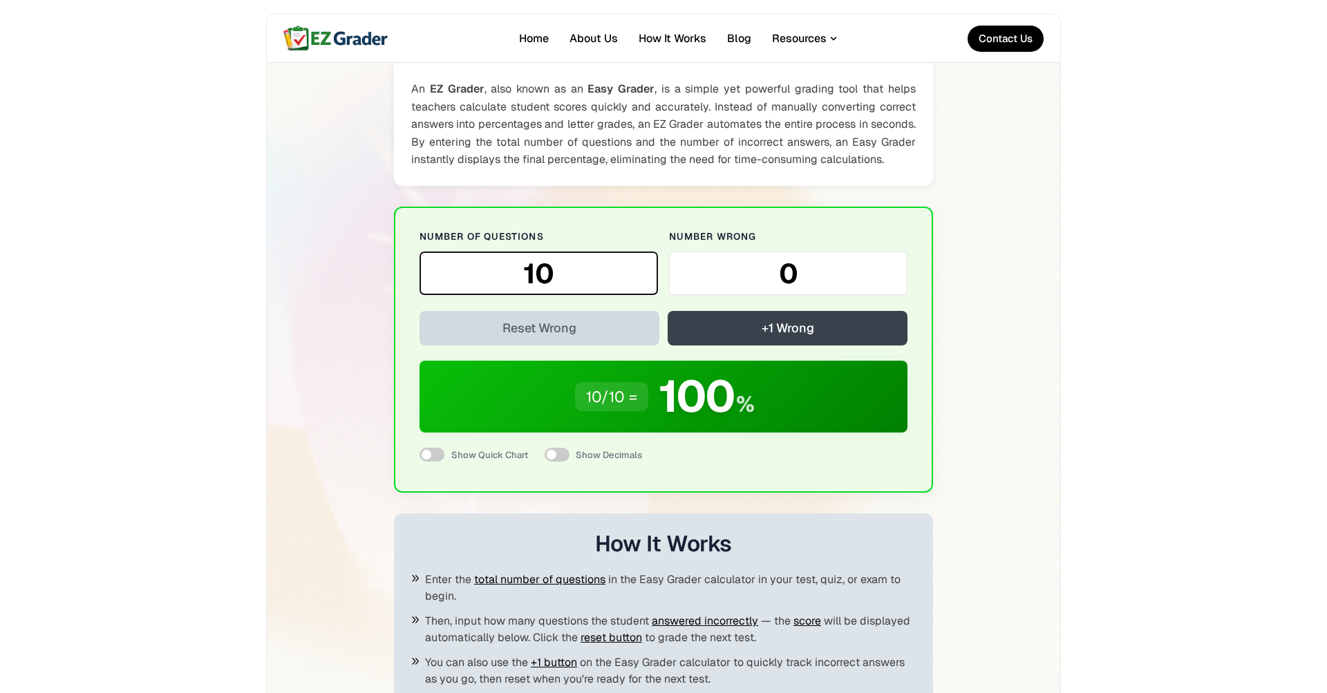 A modern digital grading tool designed for teachers and students to quickly calculate test scores and letter grades.