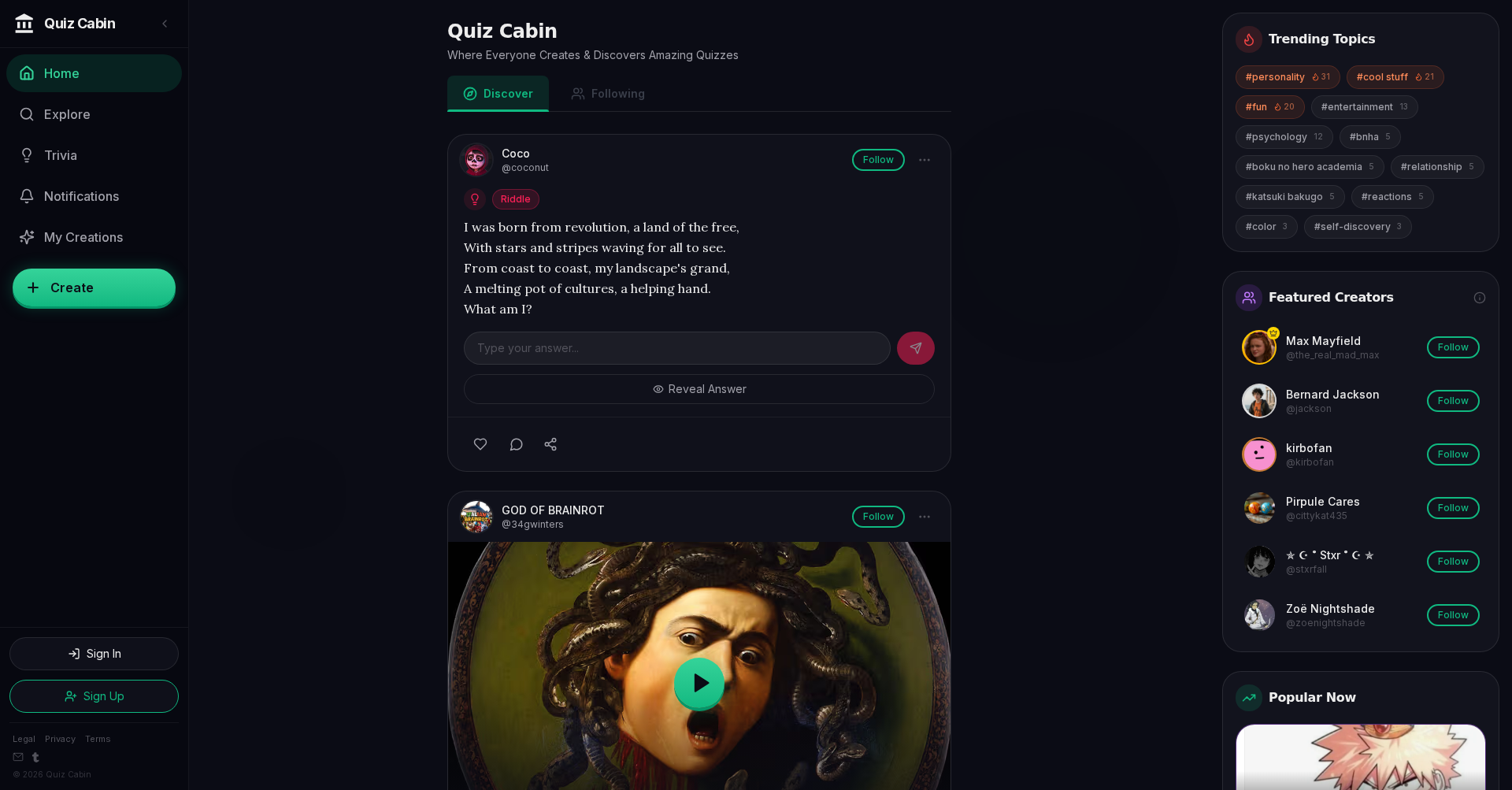 An interactive online platform for creating and taking diverse quizzes, from personality tests to trivia challenges and brain games.