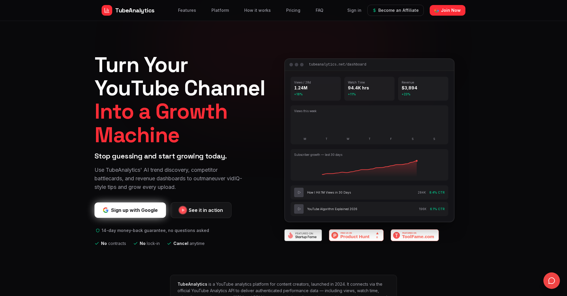 A specialized analytics platform for YouTube creators that provides AI-driven trend discovery, competitive intelligence, and advanced revenue optimization.