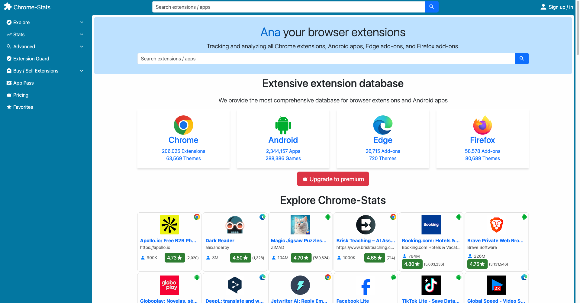 Chrome Stats is a comprehensive analytics platform designed specifically for Chrome extension developers and owners, providing detailed insights into extension performance and market position.